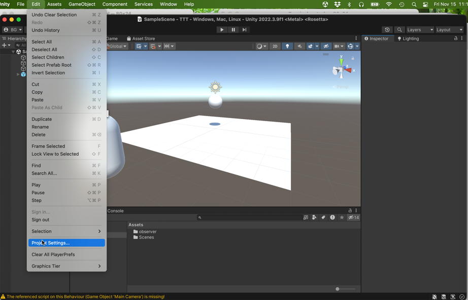 First, select "Project Settings" from the main Unity "Edit" menu: