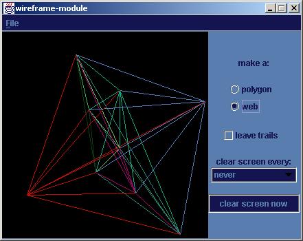 wireframe-module simply draws lines between discs. This creates an illusion of a floating 3-dimensional object (a "wireframe") on the screen. It can draw either a simple polygon (by connecting each disc with two neighbors) or a web (by connecting each disc to every other disc). It can also make the lines leave trails as they move, which creates complex and pretty patterns.