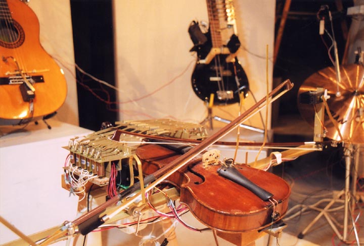 The P.A.M. Band (Partially Artificial Musicians), is a synthesis of kinetic sculpture, musical composition, theater, and technology. The concept is the rediscovery of the rich tradition of the automata, while responding to contemporary cultural issues, without using MIDI technology. The project takes the notion of musical invention to a deeper level. At the heart of P.A.M. Band instruments is a motion control card that allows for the precise manipulation of servo motors, solenoids, and DC motors. The "feel" of the energy released by the motors informs me of the nature of the potential sounds and instruments to be investigated. The first phase of the project feature mechanical solutions for traditional musical instruments, with the hint of prototypical instruments not far behind. Sequences that run the programmable motors are written in C++.